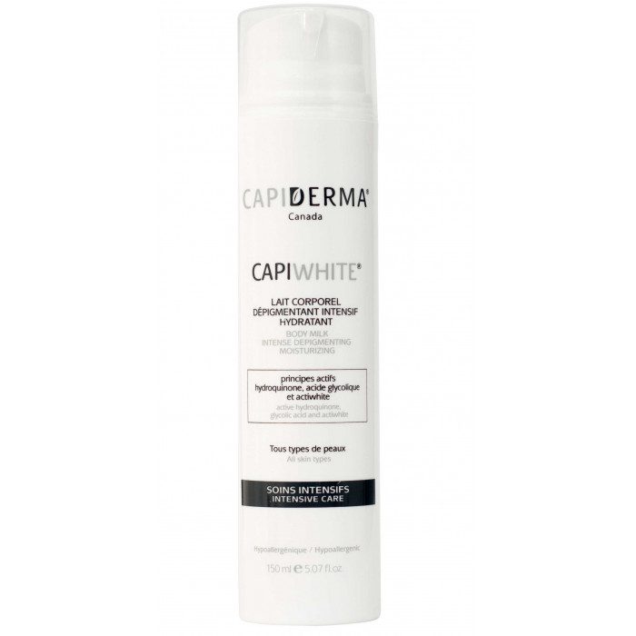 Capiderma capiwhite lait corporel dépigmentant Soin dépigmentant intensif pour le corps. Formulé pour contribuer efficacement à réduire les taches sombres, unifier le teint et procurer un effet d’hydratation prolongée. Sans parabènes.