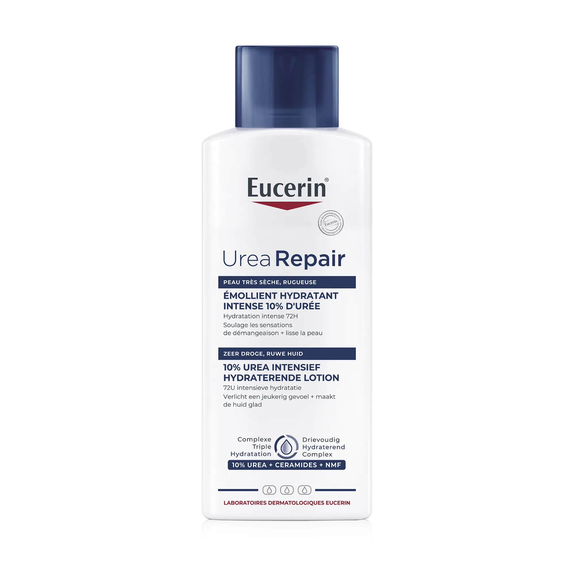 EUCERIN Urea Repair. Emollient 10% d’Urée. Apaisement immédiat de la peau sèche. Urée + céramide NMF. Elimine en douceur les cellules mortes et adoucit la peau. Peau très sèche et rugueuse – 400ml.