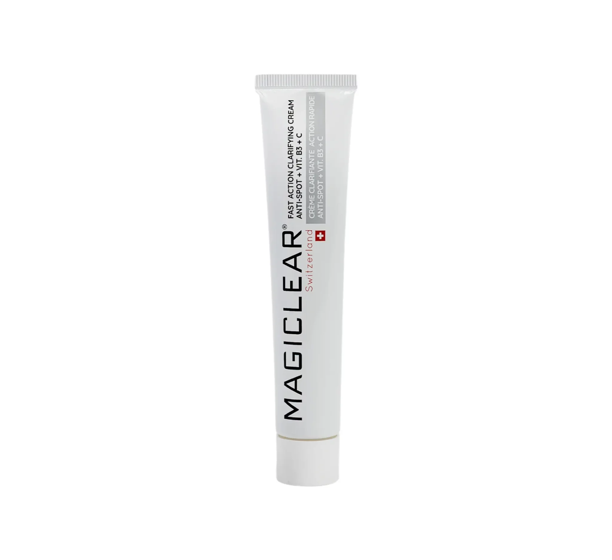 Crème clarifiante à action rapide de MAGICLEAR, unification progressive et durable du teint, élimination des cellules pigmentées, accélération du renouvellement cellulaire, blocage des récepteurs de mélanine, et réduction des taches brunes sans irritation.