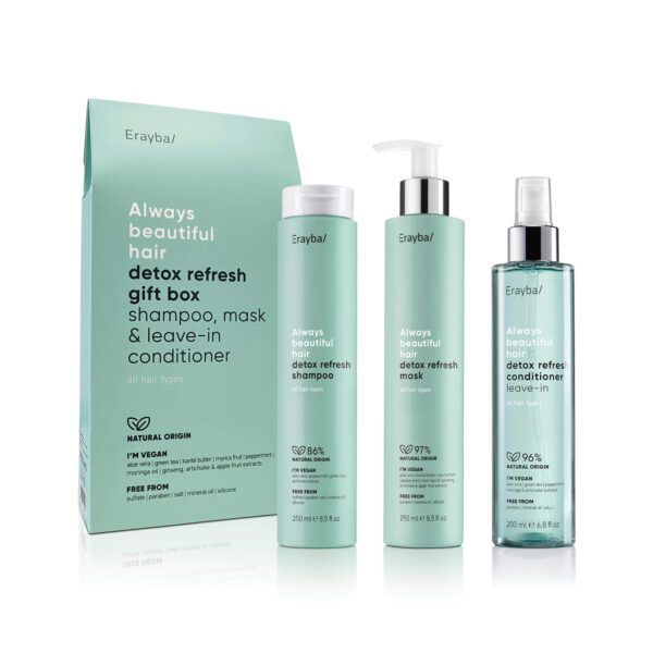 ERAYBA Abh detox refresh shampoo 250ml, Abh detox refresh mask 250ml, Abh detox refresh conditioner 200ml.