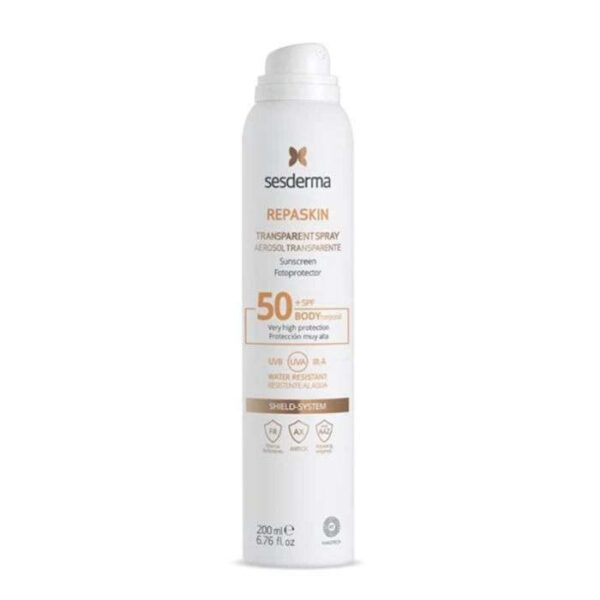 Le spray transparent Repaskin de Sesderma est un écran solaire liposomal qui protège contre les dommages causés par l’exposition au soleil en réparant l’ADN cellulaire.