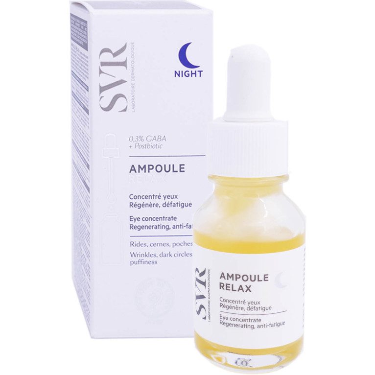 SVR Ampoule Relax Contour des Yeux Nuit permet donc de corriger différents problèmes.Proposé dans un flacon applicateur de 15 ml, ce sérum a une formule unique contenant du Gaba à 0,3 % et du postbiotique. Testé sous contrôle dermatologique et ophtalmologique, il ne présente aucun risque pour votre santé.
