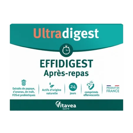 Ultradigest Après-repas VITAVEA est un complément alimentaire apportant une association d’actifs dotés d’une activité enzymatique à des probiotiques et fructo-oligosaccharides.